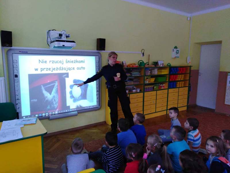 Brały w nich udział dzieci ze wszystkich oddziałów. Zajęcia odbywały się w dwóch grupach wiekowych (dzieci młodsze: „Biedronki” i „Motylki” oraz dzieci starsze: „Słoneczka”, Ufoludki” i „Wiewiórki”). Udział wychowanków przedszkola w programie Straży Miejskiej w Jaśle, to ciekawa oferta profilaktyczna mająca na celu zapobieganie i unikanie niebezpiecznych sytuacji. Dzieci uczyły się umiejętności przewidywania zagrożeń, unikania ich oraz radzenia sobie w trudnych sytuacjach zagrażających życiu i zdrowiu. Poprzez zabawy z wykorzystaniem zestawu edukacyjnego „AUTOCHODZIK” zapoznano dzieci z podstawowymi przepisami ruchu drogowego oraz wypracowano prawidłowe nawyki w zakresie dbałości o bezpieczeństwo własne i innych. Grupa najmłodsza poznała charakterystyczne elementy munduru oraz specyfikę pracy strażników. Na podstawie przeczytanej bajki „Na pomoc – Straż Miejska” poinformowano dzieci, w jakich sytuacjach mogą poprosić o pomoc strażnika miejskiego. Celem kolejnego zajęcia było rozwijanie u dzieci wrażliwości, empatii, a także nauka takich umiejętności jak opieka, wychowanie czy komunikacja ze zwierzętami. Panie funkcjonariuszki przybliżyły przedszkolakom również zasady bezpiecznego zachowania się wobec psa. Zapoznały z pozycją „drzewka” oraz „żółwia”. Pokazały jak sprzątać w miejscach publicznych po swych pupilach. Na ostatnim spotkaniu zwrócono uwagę na bezpieczeństwo podczas zimowych zabaw oraz uświadomiono im jakie sytuacje i zachowania mogą stanowić zagrożenie dla ich zdrowia i życia. Podczas wszystkich zajęć wykorzystano ciekawe i barwne prezentacje multimedialne, dzięki czemu dzieci były bardzo zainteresowane. Po każdym spotkaniu zarówno grupy młodsze jak i starsze otrzymywały ciekawe kolorowanki dotyczące omawianej tematyki.