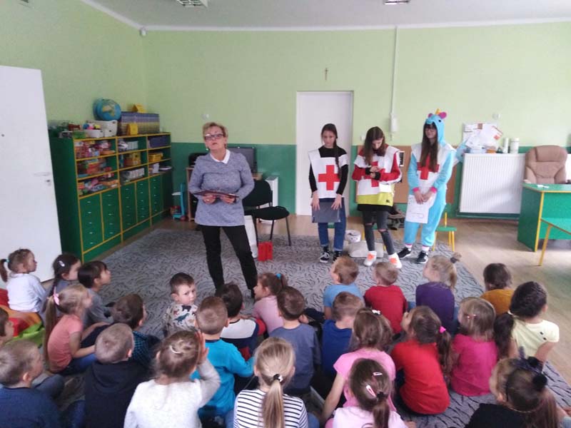 Dnia 30.10.2019 roku w ramach współpracy członków klubu „Wiewiórka” z PCK, odbyło się spotkanie z panią K. Dlugosz kierownikiem PCK w Jaśle i wolontariuszami ze Szkoły Podstawowej nr 2 w Jaśle. Dzieci poszerzył swoje wiadomości na temat działania Polskiego Czerwonego Krzyża. Dowiedziały się, kto może zostać członkiem klubu „Wiewiórka” w przedszkolu. Członkiem klubu mogą być dzieci, które: