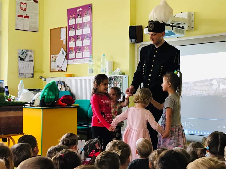 Dnia 13 grudnia 2019 r. w Przedszkolu Miejskim Nr 10 w Jaśle gościliśmy górnika. Przedszkolaki miały możliwość obejrzenia ciekawej, tematycznej prezentacji multimedialnej na tablicy interaktywnej. Górnik opowiadał dzieciom o pracy w kopalni, której towarzyszy niebezpieczeństwo utraty zdrowia czy życia. Omówił wiele surowców energetycznych, metalicznych, skalnych np. węgla czy ropy naftowej. Zaprezentował górniczy strój, symbole, flagę i opowiedział o patronce górników – św. Barbarze. Następnie wytłumaczył przedszkolakom znaczenie kolorów pióropuszy. Dzieci ponadto wysłuchały ilustrowanej bajki, rozwiązywały zagadki, mierzyły górniczą czapkę i kask. Wszystkie przedszkolaki chętnie odpowiadały na pytania i angażowały się w atrakcyjne zadania kierowane do nich przez górnika. Aktywności dzieci sprzyjała mnogość różnorodnych pomocy, przemyślany tok prelekcji i życzliwy, serdeczny kontakt niecodziennego gościa z wychowankami. W podziękowaniu za ciekawą prelekcję – wręczono górnikowi tradycyjnie upominkowy kwiat. Wykonano wiele pamiątkowych zdjęć. Na koniec dzieci otrzymały słodki poczęstunek w formie cukierków oraz piękne czapki z zadaniami umysłowymi do rozwiązywania, które utrwalały przekazywane na zajęciu treści.
