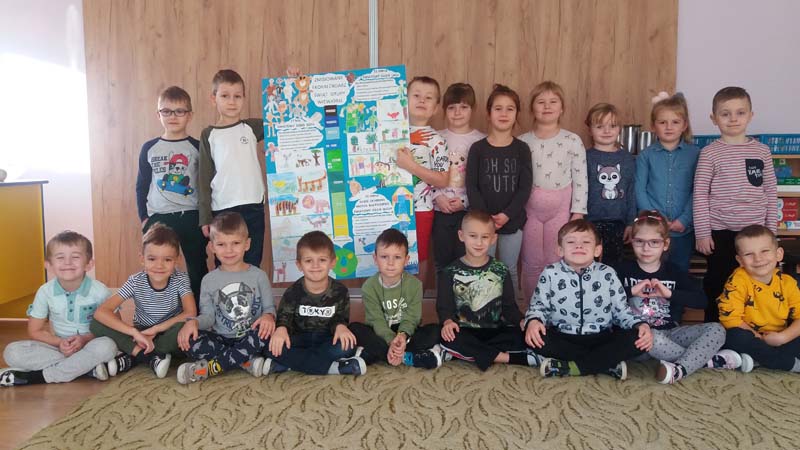 W dniach 23-25 listopada 2020 r. grupa V „Wiewiórki” realizowała IV Moduł projektu „Mały Miś w świecie wielkiej literatury” – „Zmisiowany Ekokalendarz”. Dzieci rozwijały zainteresowania przyrodą i ochroną środowiska, a przy tym kształciły wyobraźnię i aktywność poznawczą. W czasie pogadanki na temat ekologii, ustaliły jak mogą dbać o planetę Ziemię. Swoje przemyślenia przedstawiły w formie „Obrazkowej mapy myśli” wzbogaconej o wykonane przez siebie kolorowanki Ziemi. Miały możliwość segregowania śmieci, gry w zbieranie odpadów, uczestnictwa w zabawie ruchowej „Śmieci do pojemnika” i elementach ćwiczeń gimnastycznych „Segregujemy śmieci”. Z posiadanych przez grupę tematycznych pomocy utworzono „Kącik ekologiczny”. Metodą „Burzy mózgów” w oparciu o tematyczne plakaty i obrazki przedszkolaki ustaliły: do czego potrzebna jest woda, dla kogo i gdzie ją znajdujemy, a w końcu jak ją oszczędzać. Obejrzały film edukacyjny o wodzie i uczestniczyły w zmodyfikowanej na potrzeby grupy grze ruchowej „Jestem przyjacielem wody”. Ponadto słuchały tematycznych piosenek, rozwiązywały zagadki słuchowe i opisowe oraz opracowały własny projekt odznaki „Przyjaciel przyrody”. Na bazie wiadomości o różnorodnych świętach ekologicznych wybrały: Światowy Dzień Kota, Dzień Ochrony Morza Bałtyckiego i Światowy Dzień Wody oraz Światowy Dzień Lasu. Dzieci słuchały utworów o kotach, wodzie i lesie pozyskanych z materiałów projektu, w oparciu o które powstały tematyczne prace. Następnie metodą „Burzy mózgów” ustalono: jak należy zachowywać się w lesie? oraz jakie koty mieszkają w środowisku domowym, a jakie są dzikie. Zdecydowano, że w przyszłych obchodach wybranych świąt ekologicznych dzieci będą ubierać się na umówione kolory i zrealizują plany działań, które jeszcze bardziej rozszerzą ich wiedzę w omawianym zakresie. Przedszkolaki wspólnie wykonały plakat „Zmisiowany Ekokalendarz” dla grupy ujmując w sposób słowny i rysunkowy poznane i planowane do rozszerzenia treści.