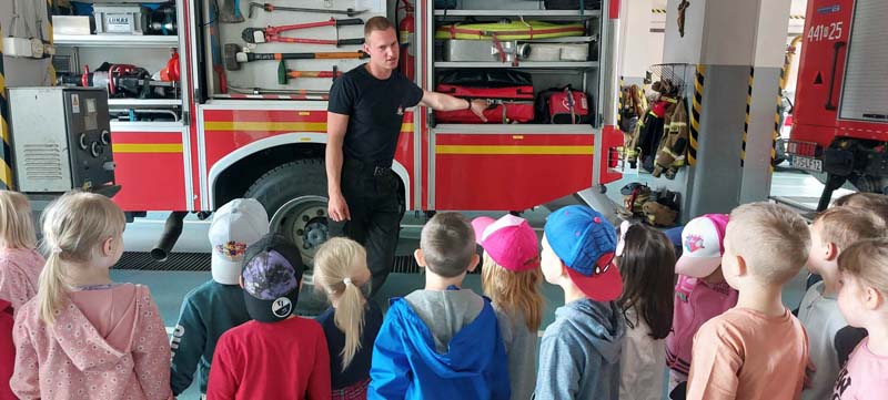 Dnia 26 maja przedszkolaki ze starszych grup udały się z wizytą do Komendy Powiatowej Państwowej Straży Pożarnej w Jaśle. Starszaki w trakcie spotkania poznały wyposażenie wozów strażackich, sprzęt, jaki używa strażak podczas akcji ratunkowych. Oprócz poznania tajników pracy strażaka przedszkolaki zdobyły bardzo cenną wiedzę na temat zasad bezpieczeństwa. Młodsze dzieci także miały okazję poznać specyfikę pracy strażaków podczas zorganizowanego spotkania w naszym przedszkolu. Strażacy w bardzo ciekawy sposób omówili i zademonstrowali wyposażenie konieczne do wykonywania swoich obowiązków. Składamy serdeczne podziękowania Strażakom za miłe przyjęcie.
